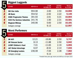 Take the JM Basic Fund, which has an AUM of Rs 554.52 crore and has lost 2.92 per cent annually in the past three years. The fund focuses on basic industries, such as infrastructure, energy and real estate, and over 80 per cent of its corpus is invested in small-cap and mid-cap stocks. This aggression worked wonders in 2006 and 2007, when it notched up returns of 43 per cent and 111 per cent, respectively, outperforming other funds by a huge margin. But the overexposure to real estate and reliance on mid-caps and small-caps proved catastrophic in 2008, when it lost 75 per cent. Despite phenomenal returns of 100.41 per cent in 2009 (the category average was 84.32 per cent, while the Nifty rose 75 per cent), the fund remains in the doghouse, with a single star rating from Value Research. The lesson for investors: stay away from sectoral and thematic funds as they overexpose themselves to a single sector.It's also prudent to keep new funds at bay. Six of the 36 worst laggards in the past three years were less than a year old in May 2007. Yet, investors thought nothing of pouring in Rs 3,000 crore in these untested funds. The average return from these schemes in the past three years has been -2.27 per cent.