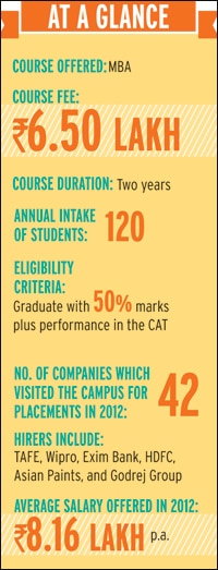 buildings are bereft of frills. Nor does it have any superstar professors in its faculty. It also charges a relatively modest sum of Rs 6.50 lakh for the two-year MBA programme it offers.