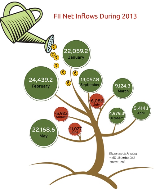 Karvy's Goel says FII inflows are likely to rise only when there are definite indications of growth. "In the short term, tightening of monetary policy is going to slow economic activity. We are expecting growth of around 5% for the financial year with sub-5% growth in the first two quarters. We expect FII investments to resume once there are definitive signs of growth revival," he says.