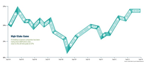 There are 111 companies in the BSE 500 index in which FIIs increased stake from December 2013 to September this year. Of