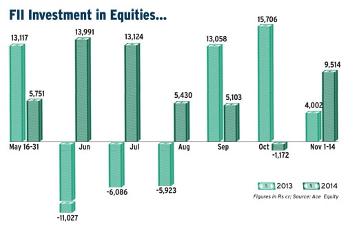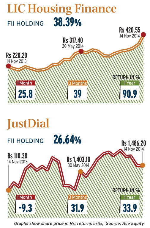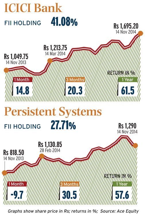 On, November 7, there were 111 companies in the BSE 500 index in which FIIs increased stake in every quarter from December 2013 to September 2014. Of these, 106 gave positive returns during the period.