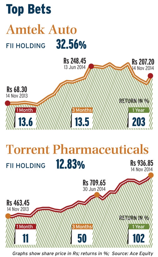 Torrent Pharmaceuticals: Torrent is a big player in cardiovascular and central nervous system segments. FIIs increased stake from 10.54% at the end of December 2013 to 12.83% on November 12 this year. The stock rose 105% to Rs 966.65 this year till November 12.