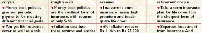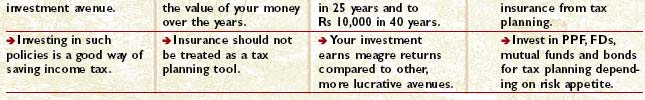 Not only is the projection of 25% returns foolish, it is also disallowed by the Insurance Regulatory Development Authority (IRDA) guidelines. The regulatory body permits insurance companies to assume only 6% and 10% returns for illustrating the benefits payable to the policyholder. But dodgy insurance agents pay little heed. Leaflets on Money Plus with returns projections of 18% and 25% have been floating around since the policy was launched in December 2006.