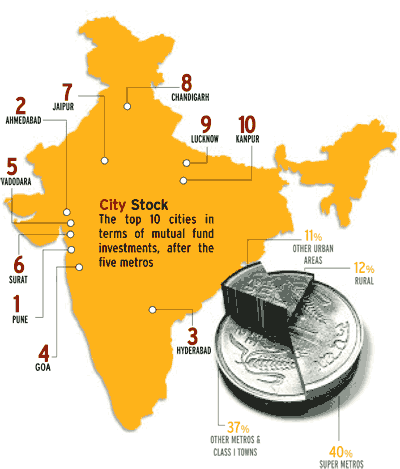 Till recently, investors in small towns were constrained by limited information and little access to mutual funds. They were forced to rely on traditional (and lowreturn) investments such as the post office small savings schemes, National Savings Certificates and insurance. Mutual fund houses also did not bother too much about these markets. The neglect of small towns is evident from the results of the Invest India Incomes and Savings survey carried out by IIMS Dataworks in 2007. According to this survey, over 90% of working Indians with incomes were unaware of the existence of mutual funds. Of the people who knew, over 30% could not recall a single mutual fund brand. The top five metros still account for 80% of the total investment in mutual funds.
