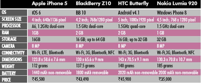 With iOS running exclusively on Apple devices, our obvious pick was the iPhone 5. BlackBerry (earlier Research In Motion) only has one device running the new BlackBerry 10 operating system. There are only a handful of devices running on Microsoft's new Windows Phone 8 operating system. After testing both the HTC 8X and Nokia Lumia 920, we decided to settle for the latter.