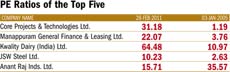 Avinash Gupta, vice president, equity research at Bonanza Portfolio also has a stock tip for investors, "The price of the share goes up if the earnings per share (EPS) grows or price-earnings ratio (PE) is expanding. If both are going up, investors reap windfall gains." According to data from Ace Equity, adjusted EPS (adjusted for stock splits, bonus shares and other corporate actions) and PE figures of a majority of stocks which have given returns of more than 1000% have risen consistently (See Stocks That Soared...). From March 2005 to March 2010, EPS of CORE Projects and Technologies surged 1,629.6% to Rs 11.34 followed by Manappuram General (1,109.05% to Rs 3.52) and Kwality Dairy (717.5% to Rs 0.58).