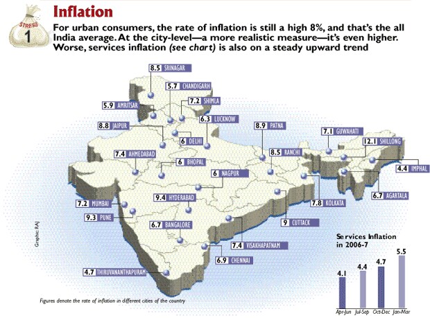 A senior manager with an MNC in Jamshedpur, Sanjay Prasad is doing quite well for himself. Nonetheless, he has drastically cut back expenditure to keep his finances on track. Weekly family outings have reduced to a monthly ritual. “Instead of going back home for lunch, I now carry tiffin to office to control fuel expenses,” he remarks. Indeed, inflation is no longer the malady of metros and Tier I cities alone. Tiny Shillong to chilly Srinagar are in the grip of price rise higher than the all-India average.