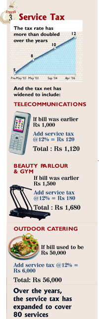 In addition to value, volume of service consumptions has also grown. In fact, consuming more services is one of the defining parameters of improved standards of living. So as you become more prosperous, cost of maintaining that prosperity rises alongside. Ironically, this is a point of no return. You would hardly wish to compromise on the prospects of moving up in life just because living will become dearer. Moreover, you are helpless in the face of these expenditures. Bhopal’s Madhuri Moghe agrees. A victim of the increasing addiction to mobile telephony, she rues, “Earlier we had only one landline connection. With three mobile phones in the house now, costs were bound to rise. But no matter how much we cut back on talking, there is no escaping the service tax menace.”
