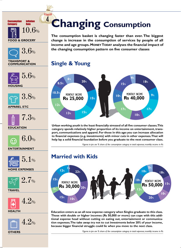 Living with Mohit’s parents now, the working couple will be moving out on their own soon. Multiple incomes had insulated them from feeling the heat on their budget. But as they tot up future living expenses, it is clear that services and rent will gobble up most of their earnings. “We will try to be careful, but there is little that can be done about it,” says Charu blandly. Not entirely correct, but we will come to that later.