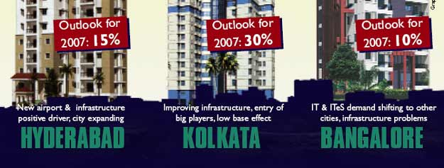 Growth in real estate prices will certainly slow down significantly in 2007. Last year saw the sector grow by an impressive 30% which includes a regional variation of 75- 125% not counting the intra city variations. Price hikes overshot the growth in salaries.