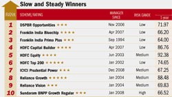 Yet, this large-cap-oriented fund is among the most consistent wealth creators in the crowded universe of diversified equity funds. It might not have done as well as some mid-cap funds during the bull runs, but then it has not fallen as hard during the bear phases. Managed by Prashant Jain, the Rs 7,000 crore fund proved its mettle in 2008, when it fell only 45 per cent compared with the 55 per cent drop in the category average. In the past five years, it has given annualised returns of 30.35 per cent. For the past 10 years, this figure has been an envious 27.77 per cent. An investment of Rs 10,000 in the fund on 1 May 2000 would be worth Rs 1.16 lakh today. During the same period, the BSE 200 rose 15.84 per cent. Whoever said mutual funds can't match the returns from stocks can eat his words.We have considered the long-term performance of funds to identify 10 such consistent wealth creators. Value Research has a robust star rating system based on the long-term performance and risk-adjusted returns. The results were surprising as well as flattering. Six of the 10 most consistent performers had figured in our 2007 list of best equity diversified funds. This validates our ranking and the rating system developed by Value Research. These schemes should form the core of an equity portfolio for any mutual fund investor.