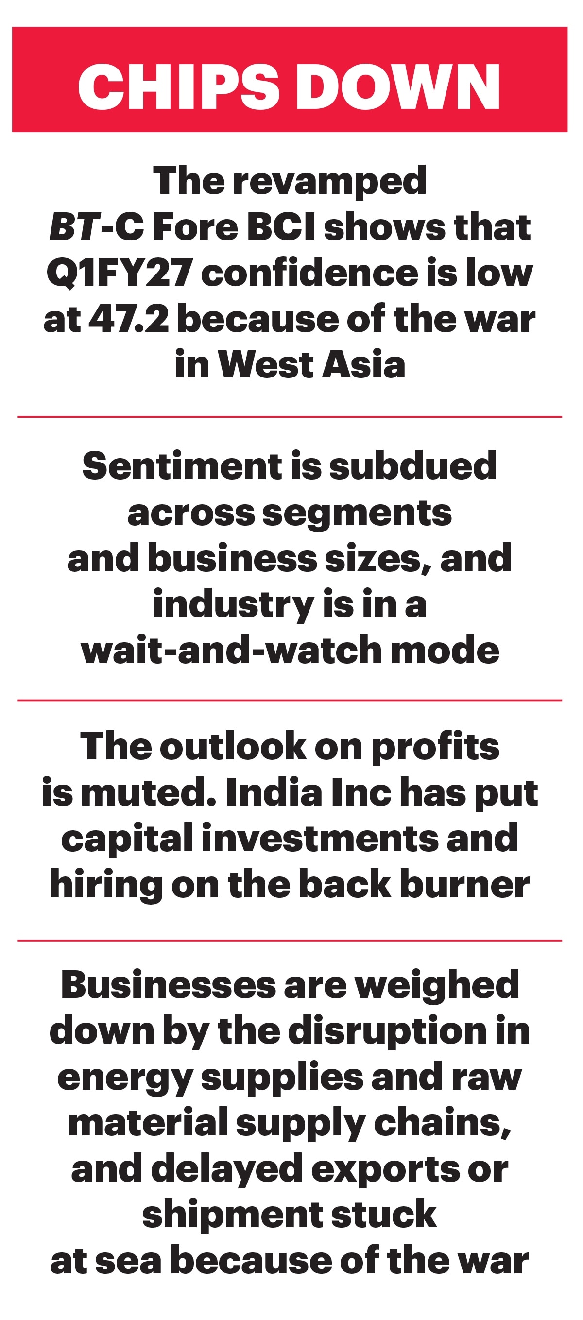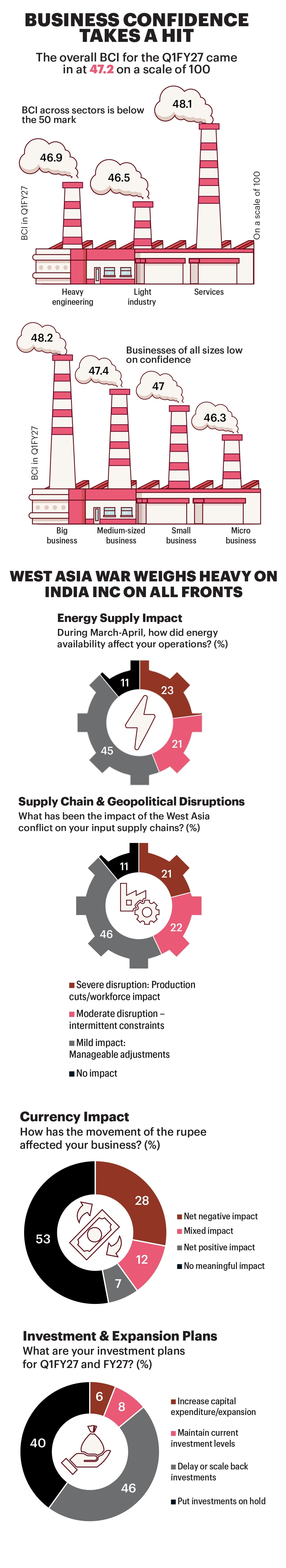 The Business Confidence Index (BCI) came in at 47.2 on a scale of 100 in Q1, reflecting the high degree of uncertainty in which companies are operating. A reading below 50 indicates a negative mood and severe stress for businesses. The reading for Q1FY27 is almost similar to the pessimism seen at the start of 2025 when the US, under President Donald Trump, began its trade war and the BCI fell to a 15-quarter low of 47.7 in Q4FY25. Prior to that, the BCI had touched an all-time low of 43.2 in the April-June 2021 quarter at the height of the second wave of the Covid-19 pandemic.