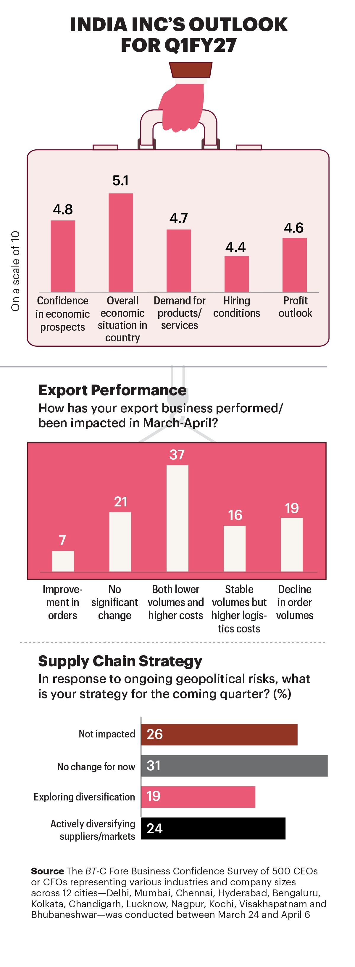 The BT-C Fore Business Confidence Survey of 500 chief executive officers and chief financial officers for the first quarter of financial year 2026-27 (Q1FY27) reflects this grim mood. It reveals that corporate India’s outlook is bleak as fresh challenges from the war forced them to go back to the drawing board.