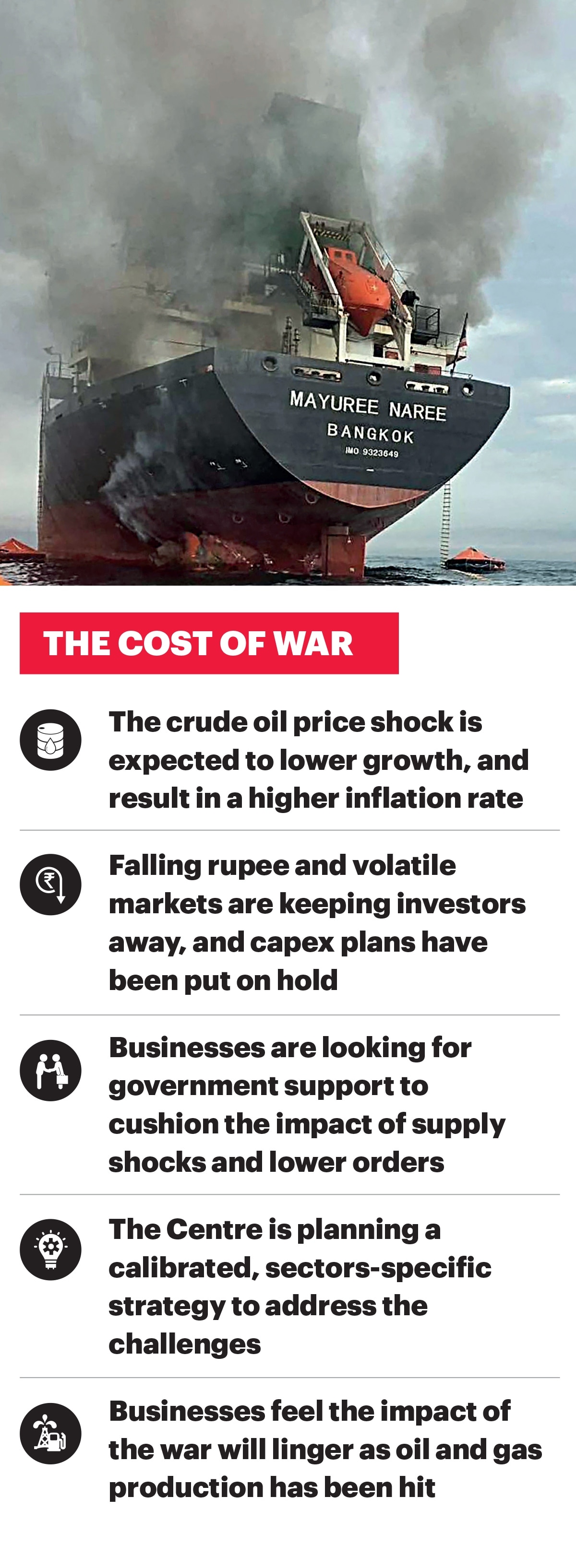 Starting with the blockade of the Strait of Hormuz that led to delayed shipments, the war quickly expanded into an energy shock as oil and gas imports from the region ground to a near standstill. Then there were disruptions in supplies of critical raw materials, including petrochemicals. While the government is striving to improve and normalise supplies, prices have risen, increasing troubles for India Inc.