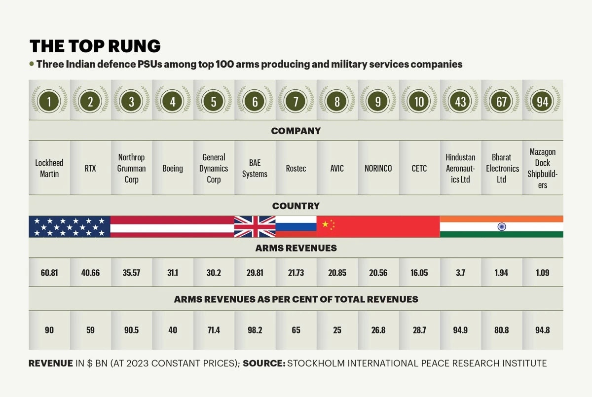 India’s defence PSUs have over the years gained size and scale. Hindustan Aeronautics, Bharat Electronics and Mazagon Dock Shipbuilders are among the world’s top 100 arms producing and military services companies, according to SIPRI rankings for 2023, published last December. Hindustan Aeronautics, with defence revenues of $3.7 billion, was at the 43rd place.