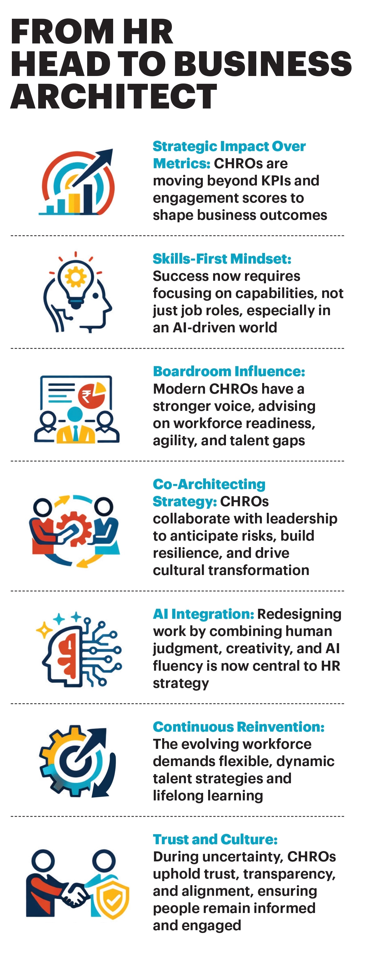Adding a business leader’s perspective, Sandip Ghose, CEO of MP Birla Cement and a corporate strategist, notes: “Much of the traditional CHRO role is now pushed down to line managers. The nature of work and the nature of the workforce have both changed.”