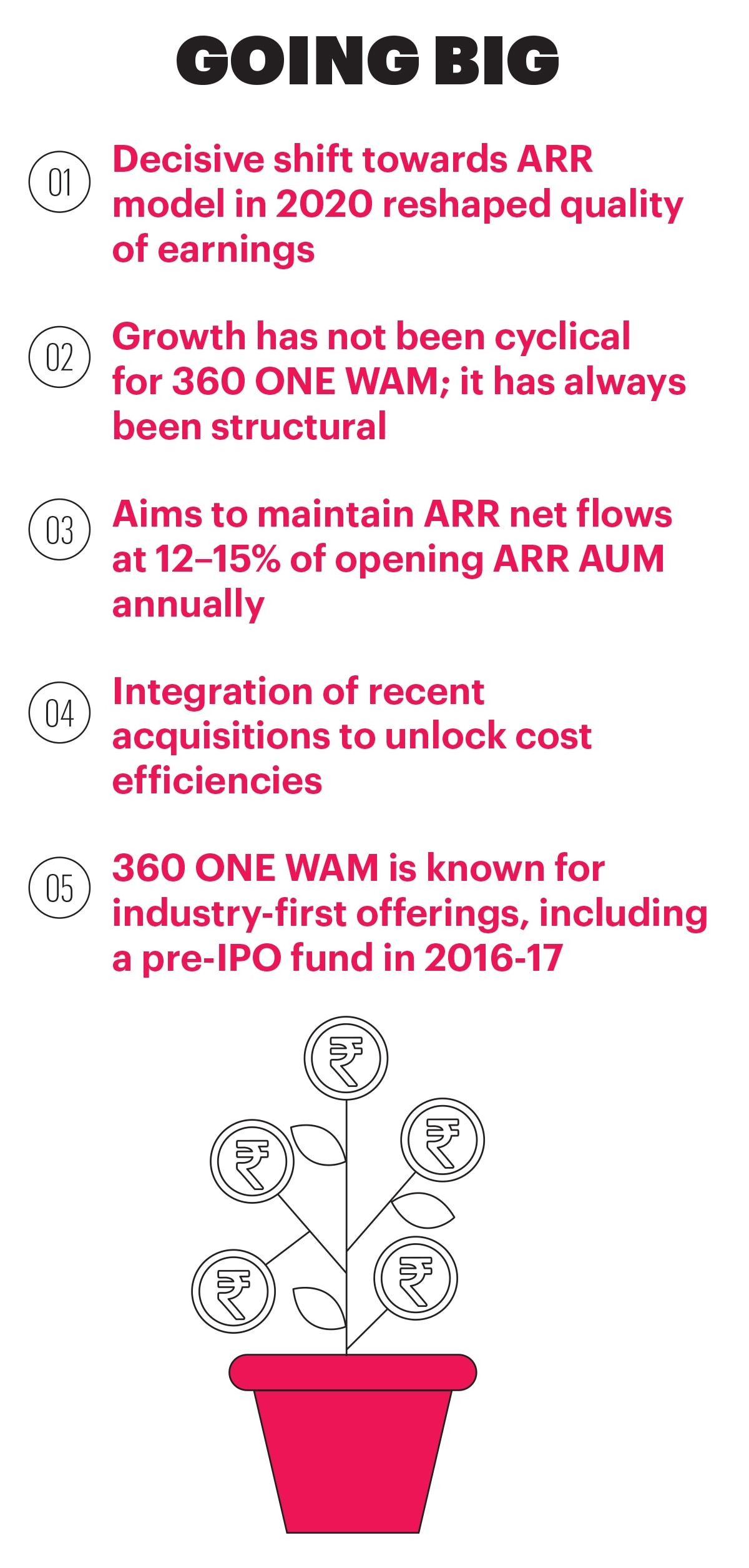 360 ONE WAM’s growth has been anchored in a structural pivot, from product distribution, advisory, episodic revenues, to annuity-based payments. Bhagat recalls the decisive shift towards the annual recurring revenue (ARR) model in 2020 that has hugely improved the quality of earnings. He says the company moved from product distribution to offering solutions, positioning itself as a goals-based, open-architecture advisory platform.