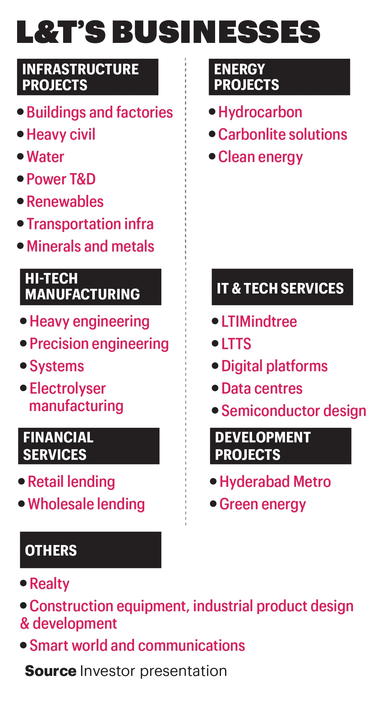 L&T is a complex conglomerate with a maze of businesses. “Projects are still a big part of what we do and that includes construction of infrastructure projects. Energy is also big,” says Subrahmanyan. There is also renewable energy. “Then, there is manufacturing, which is heavy engineering and precision engineering (defence),” he says. The services piece has IT and financial services.