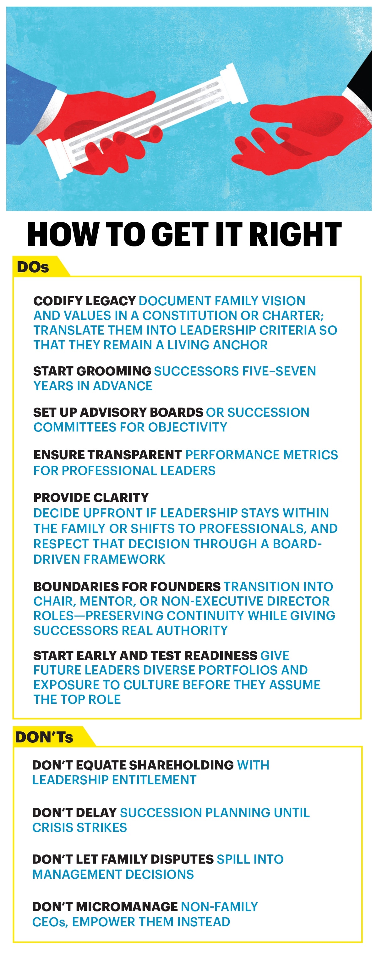 “Long-serving employees, customers, and partners have built deep trust with the family name and replacing that with a non-family professional requires deliberate credibility-building,” says Lakhotia.