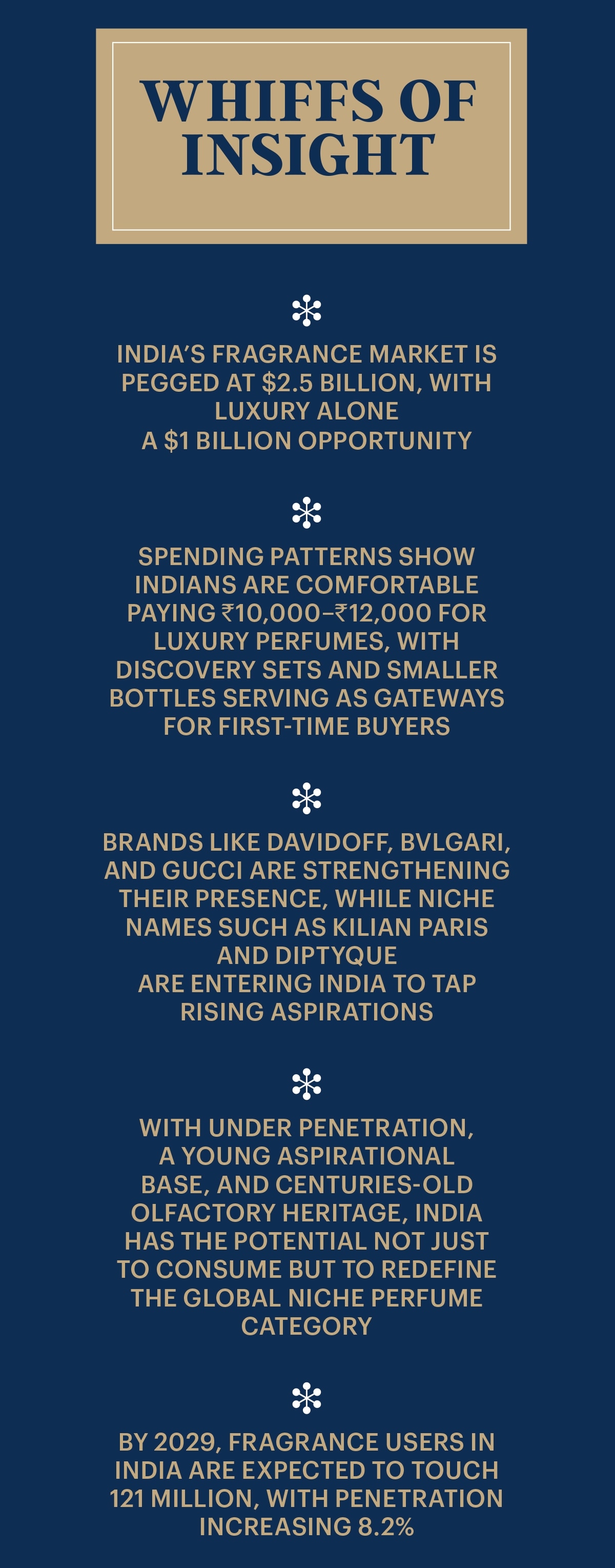 Within India’s fragrance industry, the luxury segment alone is a $1-billion opportunity, expanding at 9% annually, according to a report by Basic Roots. Unsurprisingly, global powerhouses are rushing in. Over the past few years, labels such as Kilian Paris and Essential Parfums have made their entry, joining established names like Bvlgari, Gucci, and Davidoff that already cater to India’s rising appetite for fine scents.