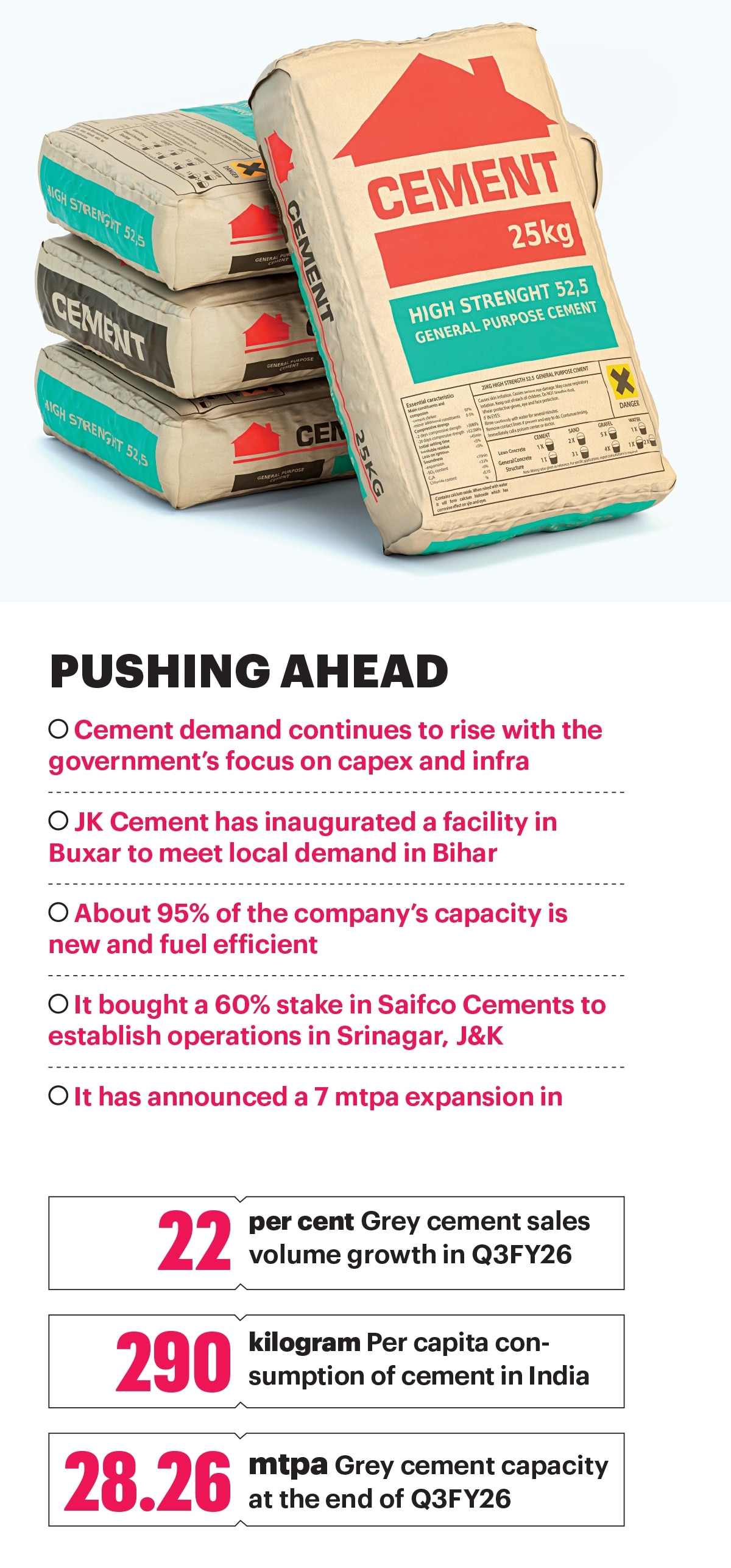 JK Cement had a grey cement capacity of 28.3 mtpa at the end of the third quarter of FY26. It recently started a 3 mtpa grey cement grinding unit in Buxar, Bihar, which will take its capacity to over 31 mtpa. What’s more, it gives the company access to the fast-growing Bihar market, which is seeing a massive infrastructure push, says Singhania.