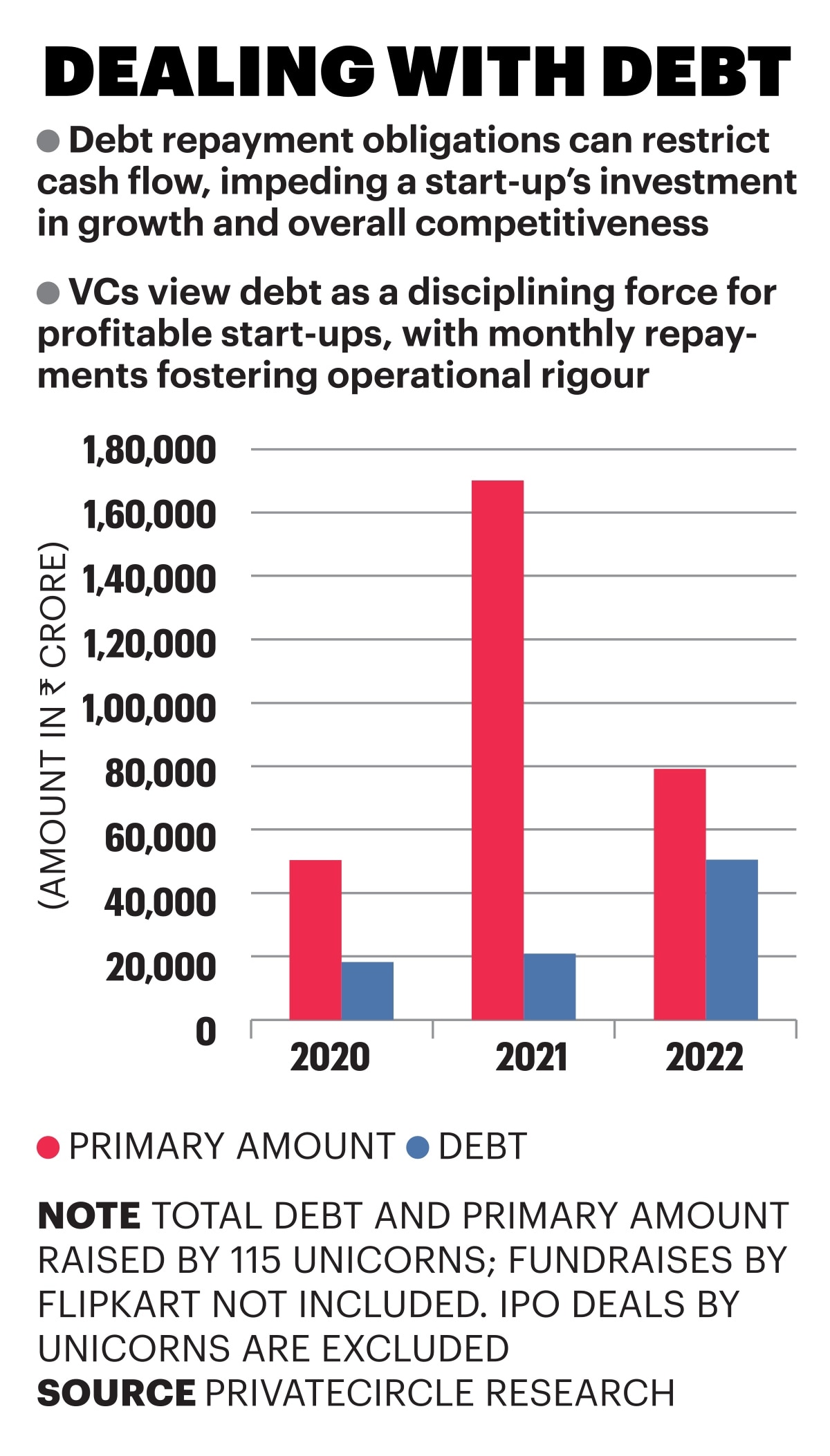 A lot of it can be attributed to the 2021 funding frenzy and the subsequent deceleration, leaving several Indian unicorns—start-ups with a valuation of $1 billion or more—with a substantial debt burden on their cap tables. According to PrivateCircle Research, a private market intelligence platform, 115 unicorns have collectively amassed over Rs 50,000 crore of debt in 2022 alone, and for many, the burn of this debt burden is already being felt.