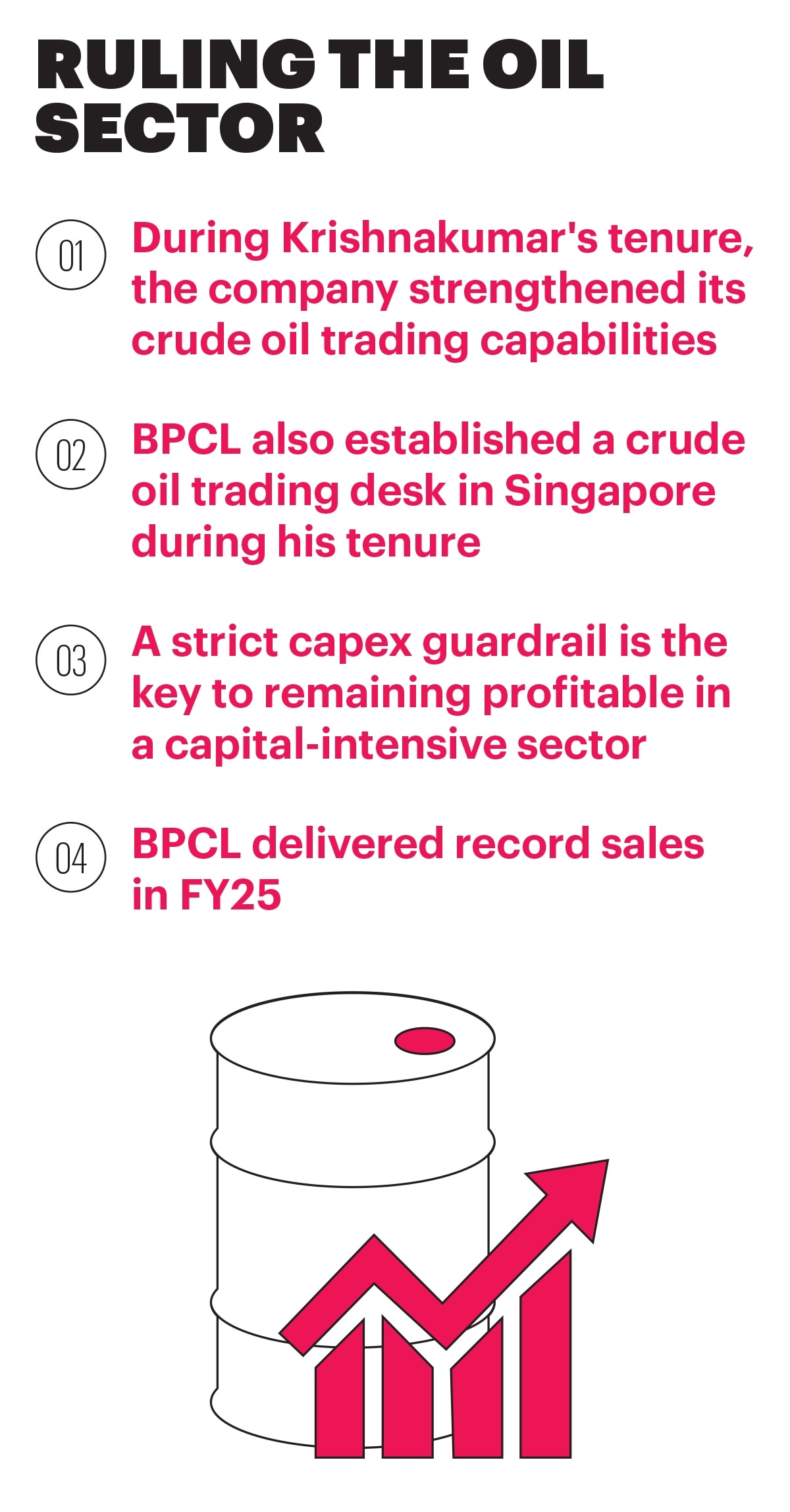 For Krishnakumar, who took over as CMD in 2023, a key milestone during his tenure was achieving the highest-ever profit of `26,000 crore in FY24. In 2020, the government decided to divest BPCL, but called off the plan in 2022. The divestment proposal affected the company; it undertook limited investments and few projects. Also, the morale of employees was low, with some people leaving the organisation.