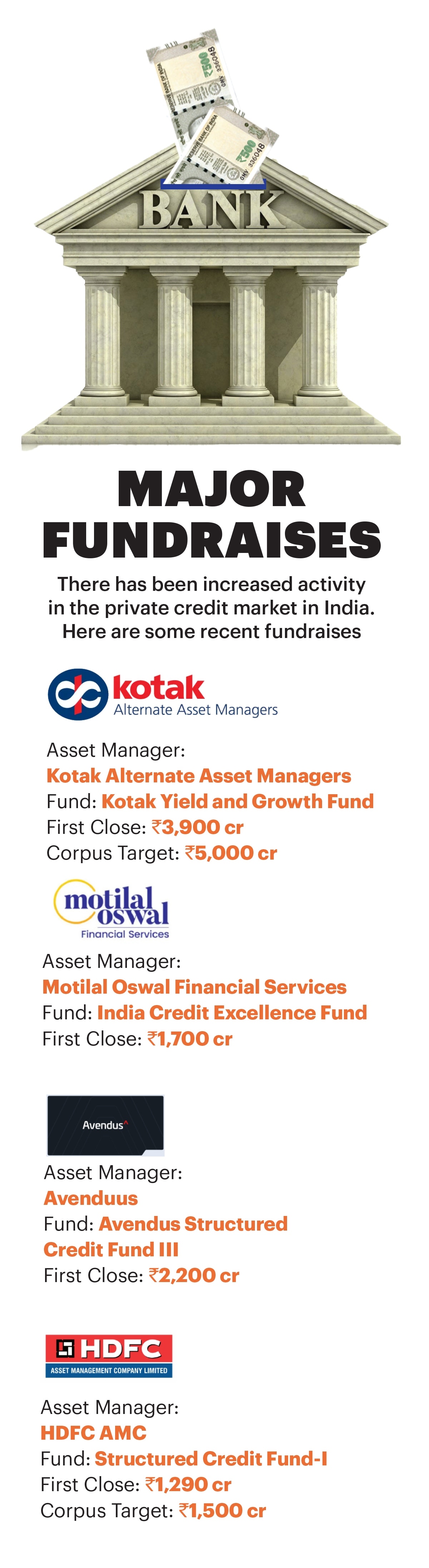 Sample this: In February, Kotak Alternate Asset Managers announced the first close of the Kotak Yield & Growth Fund, a category II Alternate Investment Fund (AIF) with a target of Rs 5,000 crore. The first close of Rs 3,900 crore was the largest private credit fundraise in India.