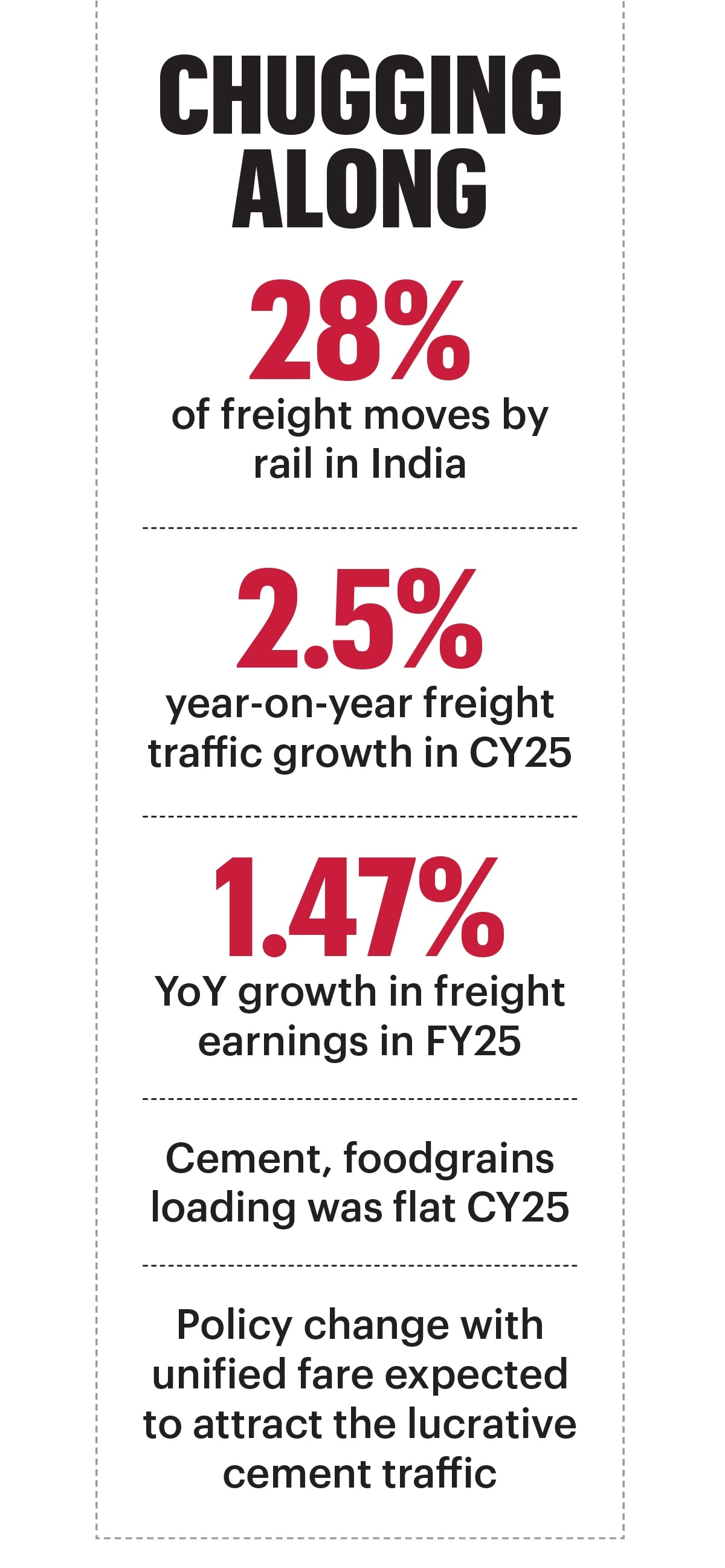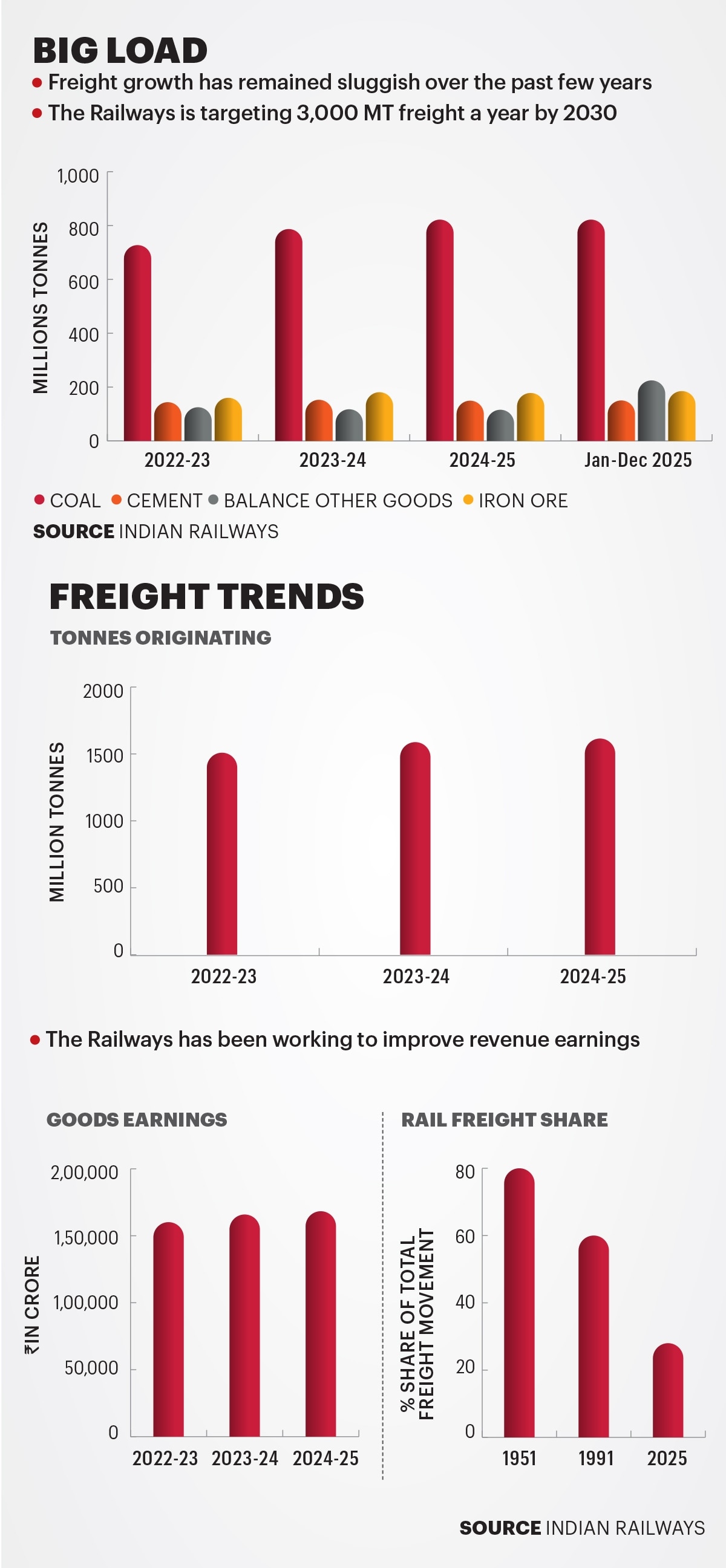 The Railways moved 1,656 million tonnes (MT) in calendar year 2025. It has plans to almost double freight traffic to 3,000 MT by 2030. Roads have grabbed a higher share of freight with faster and shorter connectivity between origin and destination points.