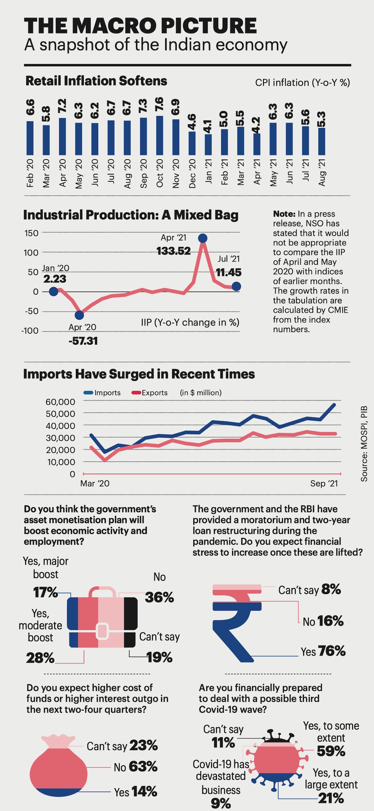 As a supplement to the survey, we assess other economic indicators like export-import, index of industrial production (IIP) and consumer price inflation (CPI). In July, IIP grew 11.45 per cent on an annual basis, and CPI cooled off a bit to 5.3 per cent in August. Exports jumped 21.3 per cent in September year-on-year, while the spike in imports was 84.6 per cent.