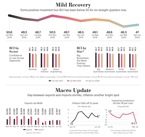 As a supplement to the survey, we do an assessment of other economic indicators. These are trade, index of industrial production (IIP) and consumer price inflation (CPI). The key industrial output indicator, IIP, continued to slide in May. It fell 34.7 per cent compared to the same month last year. This was better than the 57.6 per cent contraction in April. Retail inflation grew 6.09 per cent in June, marginally higher than the RBI's upper margin of 6 per cent.