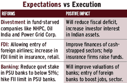 With the support of over 300 MPs in the Lok Sabha, the UPA can push through pending finance bills and reintroduce those that have lapsed. These could hike the FDI limits in insurance and banking. Manmohan Singh can even sell the government stake in profitable PSUs such as the Power Grid Corporation, Rural Electrification Corporation and Oil India. “Given the comfortable majority, reforms can be enacted at a fast pace,” says Sonal Varma, economist at Nomura Securities.