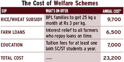 In the past few years, when the UPA pursued welfare schemes, fiscal prudence took a back seat. As a result, the combined fiscal deficit of the Centre and the states is expected to more than double to 10% of GDP in 2009-10. Poll promises like cheaper rice and wheat and subsidised interest rates for farmers may increase the deficit. In such a case, global credit rating agencies, which have already downgraded India, may do so further.