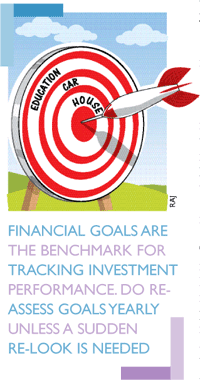 Next you need to track your income and expenses until you can develop a yearly statement (cashflow statement). This will help you to get a sense of where the money is coming from and, more importantly, where it is going. It does not mean you need to track it to the last paisa—if you can get a sense of the broad heads, it will help you track what you are spending on. Thus, financial goals become the benchmark for tracking investment performance. You should re-assess your goals annually unless something dramatic necessitates a re-look before that. By re-look I mean that if your income streams grow, you can look at serving debts or increase the value that you have attached for a goal.