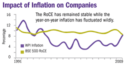 It supposes that a moderate rate of inflation allows companies to pass the increased costs to consumers and, thereby, earn increased profits, boosting return on investment. In a blow to such theories, the data over the past two decades does not show any close connection between inflation and stock market returns. The WPIbased annual average inflation has ranged between 3 per cent and 13 per cent from 1991 till March 2009, while the annual return on capital employed (RoCE) of the BSE 500 companies has remained stable between 9 per cent and 11 per cent.