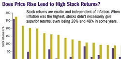 The annual average returns from the Sensex and the Dow Jones show no correlation with inflation over the past 20 years. The data, which encompasses periods of low and high inflation, shows no evidence that high inflation leads to higher, real equity returns. On the contrary, part of the data shows that low and stable inflation produces higher corporate earnings, which are again reflected in higher stock prices as investors are willing to pay a premium for superior growth. Conversely, high inflation robs the corporates' ability to pass on the increased cost to consumers and, hence, they take a hit on profitability, which leads to lower stock prices. When the inflation rate was the highest, Indian stocks lost a whopping 38-48 per cent.