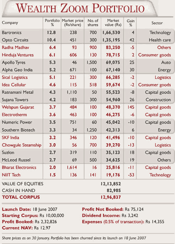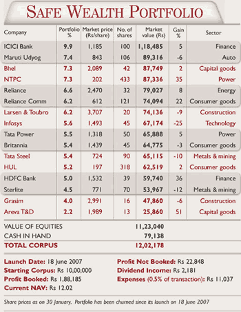 Reliance Industries’ net profit in the third quarter of 2007-8 grew 162% year-on-year. With a 6.6% allocation, it is the fifth largest holding in Safe Wealth. ICICI Bank, the largest holding in the conservative portfolio, has reported a healthy 35.18% year-on-year growth in net profit. The other finance stock in the portfolio, HDFC Bank, has done even better with a 45% year-on-year rise in net profit.