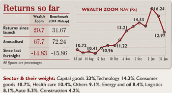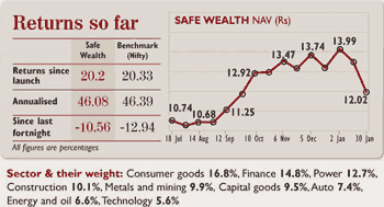 The conservative large-cap oriented Safe Wealth is benchmarked to the Nifty which fell 12.94% during the fortnight. Packed with mid caps, Wealth Zoom is benchmarked to the CNX Midcap which fell by 15.86%. Your fund manager was able to contain the fall during a time when even bluechip stocks slid 20-25%.