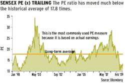 Price-to-earnings ratio: Between 1998 and 2007, the BSE Sensex moved between a PE (trailing) band of 9.83 times (Oct 1998) and 34.27 times (Apr 2000). Due to the decline over the past year or so, the PE ratio has moved significantly below the historical average (1998-current) of 17.8 times and is currently around 12.69 times.