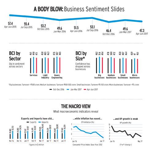 After a sharp fall at the end of last year, business confidence jumped in the first quarter of the calendar year 2017, giving an impression that businesses have shrugged off demonetisation fears. The current slump indicates that corporate leaders have turned pessimistic due to the uncertainty around GST execution and slowdown in investments.
