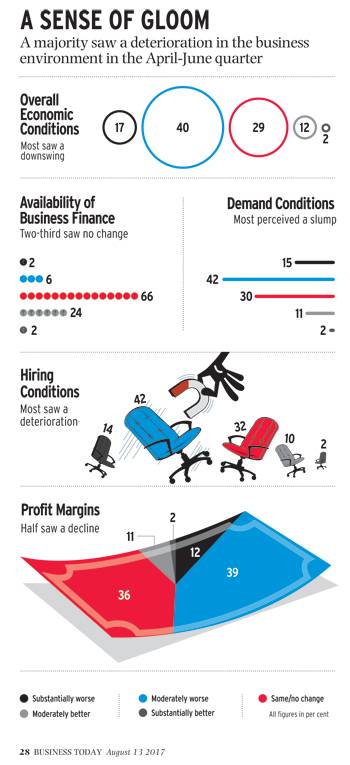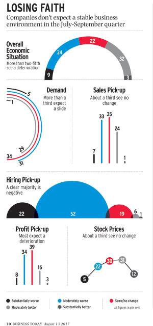 The survey indicates that business leaders are worried about a host of issues such as production level, utilisation of capacity, investments, sales, exports and hiring activities. For instance, 40 per cent expect sales to drop in the July-September period. In the previous survey, 21 per cent respondents were expecting the same.