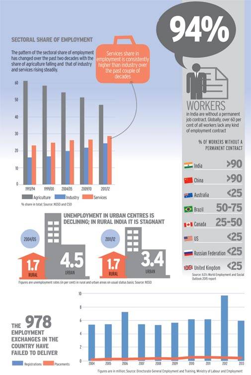 The Indian economy may be expanding at a brisk pace, but job creation in the country has remained sluggish. In fact, the compound annual growth rate (CAGR) of employment has decelerated - from 2.8 per cent between 1999/2000 and 2004/05 to 0.5 per cent between 2004/05 and 2011/12. Meanwhile, India's workforce has grown at almost 2 per cent annually between 1999/2000 and 2011/12 to 47.5 crore. It is a cause for concern. Indeed, creating job opportunities has to be top priority for the government to ensure that the rapid economic growth is inclusive and equitable.