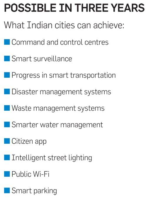Unlike in the advanced countries, lot of smartness in India is about the core infrastructure - better roads and quality water, for instance. Not surprisingly, about 80 per cent of the Rs 1.46-lakh crore proposed spending by the 60 smart cities will go into creating this infrastructure. "About 20 per cent of the investment, around Rs 28,000 crore, is for technology. Must haves are those that have direct impact on people, such as smarter water management solutions, safety and surveillance solutions, disaster management, waste management, citizen apps, command and control centres, transportation, and smarter healthcare," says Rajul Mehrotra, General Manager of Smart Cities at IBM India. Cities have also identified initiatives around intelligent street lighting, Wi-Fi, and smart parking.