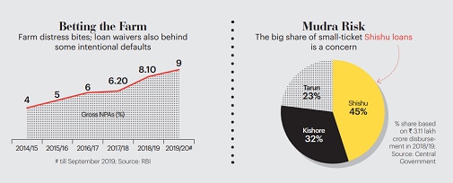 Right now, at stake is Rs 13-14 lakh crore agriculture loans. Gross sector NPAs shot up from 4 per cent five years ago to 9 per cent in the first half of 2019/20. For PSBs, the situation is worse. SBI's farm sector NPAs rose from 5 per cent three years ago to 14 per cent in the first half of 2019/20. Bank of India ended the first half of the year with a figure of 17 per cent. IDBI Bank's farm sector NPAs have touched 15 per cent. Rural distress and lack of post-shipment infrastructure are adding to the crisis. PSBs are worse off as they are given targets for lending to the agriculture sector. The government recently increased the collateral-free farm loan limit from Rs 1 lakh to Rs 1.60 lakh in what cannot be good news for banks.