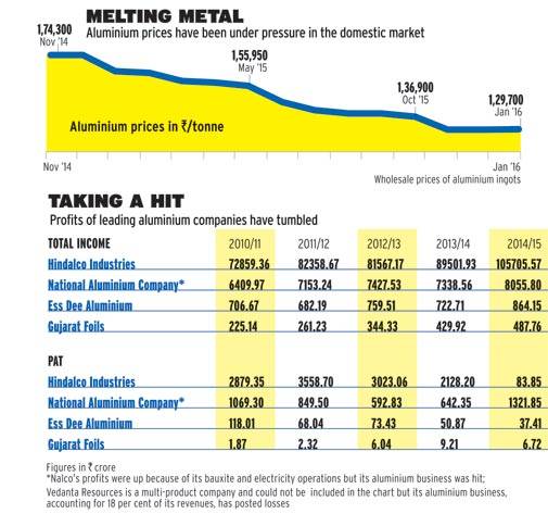 Continuous fall in global aluminium prices -40 per cent from $2,474 a tonne in November 2014 to $1,479 a tonne in January 20165 - has impacted the profitability of companies. Hindalco reported a 33 per cent decline in operating margin in the July-September quarter while Vedanta reported a loss in its aluminium business - which contributes 18 per cent to overall revenues - in the October-December 2015 period.