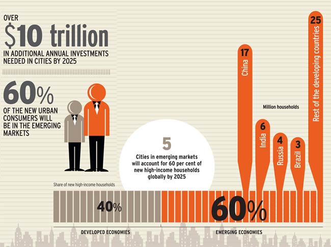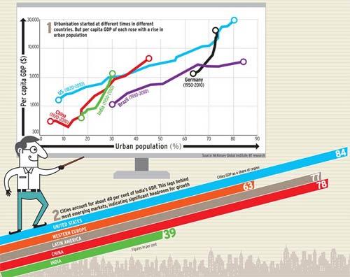 Rapid urbanisation is essential to raise standards of living in the developing world, including India. Cities are hubs of economic activity and create wealth. A wave of urbanisation is now underway in emerging nations which will lift some one billion people out of poverty and add $30 trillion to global GDP by 2025, according to a study by McKinsey Global Institute. India, too, is urbanising but has a lot of catching up to do with other developing nations, particularly China.