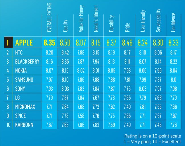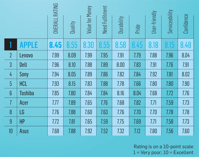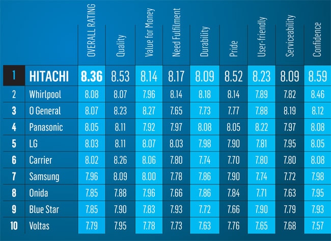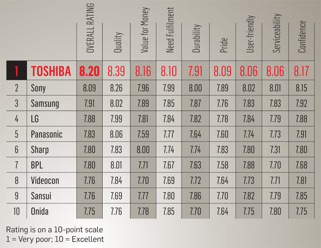 The first ever India Today Group-MDRA survey of the best consumer durable brands in India was conducted in 10 cities - New Delhi, Mumbai, Chennai, Kolkata, Ahmedabad, Bangalore, Jaipur, Indore, Bhubaneswar and Hyderabad among SECs A & B. the overall rating on a 10-point scale was taken, where 1 = Very poor and 10 = Excellent.