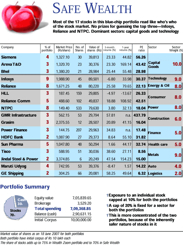 The first one, called Safe Wealth, will comprise mostly blue chips, large caps and industry lead -ers whose managements (and their actions) have been consistently world class and where there is sufficient reason to expect more of the same. The second o n e , called Wealth Zoom, will comprise a slightly riskier profile of relatively undiscovered stocks where growth prospects are more aggressive. To begin with, we will start with a corpus of Rs 10 lakh in each portfolio. Over each fortnight we will decide what to buy or sell, and use the closing price of the fortnight as our assumed price for buying and selling. We will also load this price with 0.5% transaction charges that should comfortably cover brokerage and related charges and taxes. This is to make the portfolio changes more realistic.