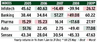 The IT sector outperformed in 2005 and 2006, but slumped in 2007 and 2008. Pharma underperformed for three years, but lost the least in 2008. The auto sector performed poorly in 2007 and has raced ahead in 2009. Note that during this jostling, the diversified Sensex continued to give decent returns, except in 2008.