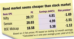 Let us consider an example. The one-year average g-sec (10-year Indian government bond) bond yield is 6.5 per cent. Without bearing any risk one can earn 6.5 per cent, so a stock will appear attractive only if its yield is higher than the risk-free rate. A stock with a PE of 10 will appeal to investors more than the stock with a PE of 12 as the former is delivering a risk premium of 3.5 per cent, which is higher than the 1.83 per cent risk premium offered by the latter. The same rules can be applied while considering the earnings yield of a stock index vis-à-vis the g-sec yield. The higher the difference, the cheaper is the stock market relative to bond market, and vice versa.